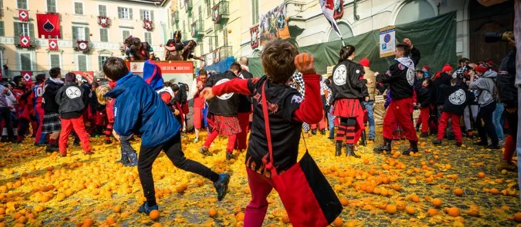 The Battle of the Oranges, a wild citrus fruit-throwing melee, erupts in which Italian town?