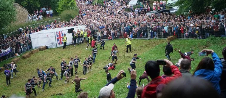 Cooper's Hill Cheese-Rolling, where competitors chase a wheel of cheese down a steep hill, rolls in which English county?