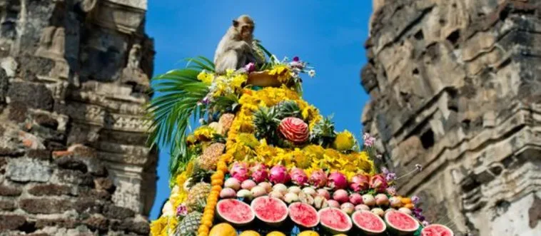 Monkey Buffet Festival, where primates feast on fruits and veggies at ancient temples, banquets in which Thai province?