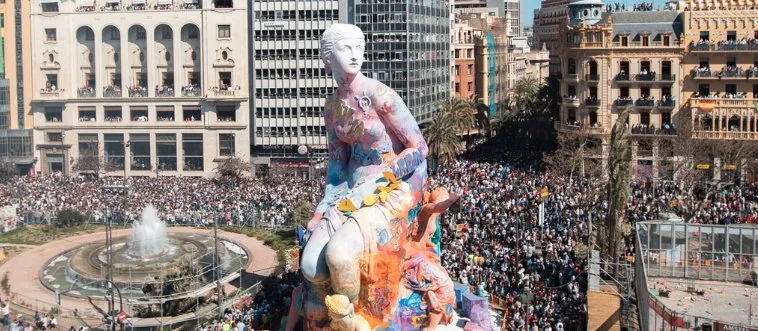 Las Fallas, where giant satirical sculptures are built and burned in bonfires, blazes in which Spanish city?