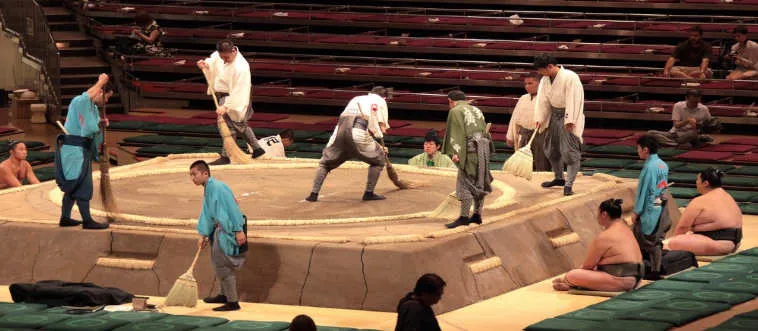 Sumo wrestlers battle on a raised clay circle called the…